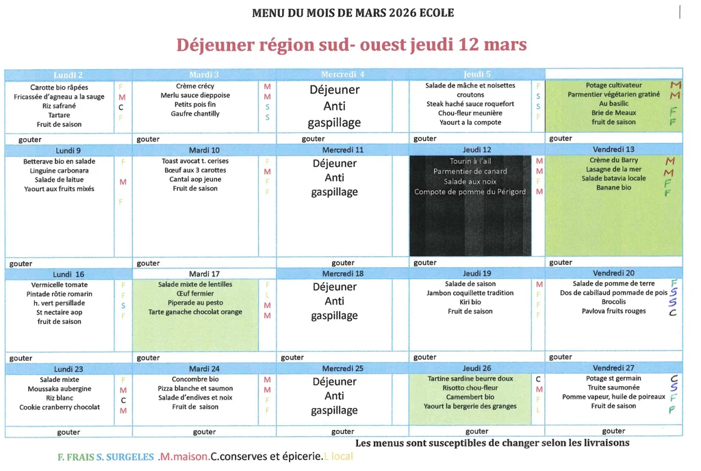 MENUS DU MOIS :